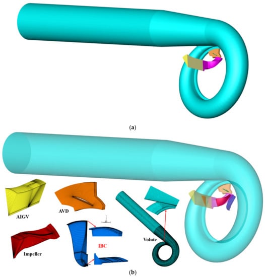 Based on the assumption that the incoming flow at AIGV inlet is circumferentially uniform and the rotating flow inside impeller and AVD passage is periodic, the numerical simulation adopts the single passage coupled computational domains consisting of IBC and all mainstream domains including AIGV, impeller, AVD, and volute. As a comparative analysis, another group of numerical calculation domains includes all conventional mainstream coupling, ignoring the influence of IBC. Figure 3 shows two groups of computational domains, which are exactly the same as the geometric model of the whole experimental machine in Figure 1.