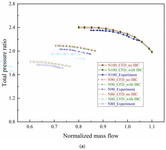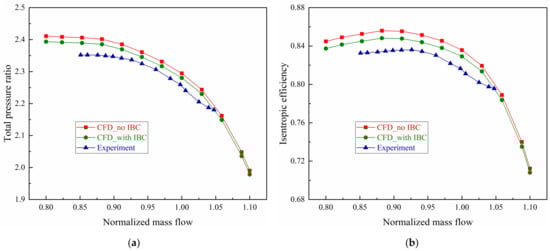 A comparison of the aerodynamic performances between numerical simulation and experimental testing is conducted to validate the calculation model. The measured results are obtained using the closed test platform in Figure 2, and the calculated results are extracted from two CFD models in Figure 3. The predicted and measured characteristic curves of aerodynamic performance parameters including PRt and isentropic efficiency (ηis) under design rotating speed are shown in Figure 4. It can be found that the design point experimental PRt is about 2.25, which are respectively 1.3% and 1.7% away from the numerical results of 2.28 and 2.29 with IBC or not; the design point ηis obtained in the experiment is about 81.50%, which are respectively 82.9% and 83.6% with deviations of 1.7% and 2.5% when considering IBC or not in the calculation. The above comparative analysis results are within the engineering permissible error range, which demonstrates the feasibility of the two CFD models and reflects the necessity of the coupled computations with IBC.