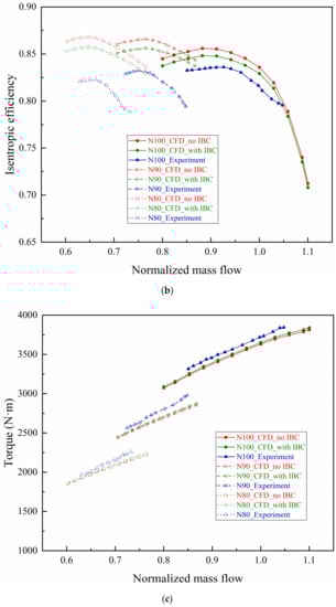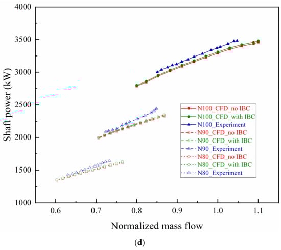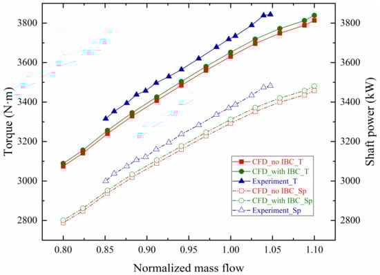 The characteristic curves of aerodynamic performance in Figure 4 show that PRt and ηis of the coupled calculations with IBC are closer to the experimental results than those without coupling. Furthermore, the predicted and measured characteristic curves of power consumption under design rotating speed are presented in Figure 5. Both torque and shaft power decrease with the decrease of the flow. The design point torque and shaft power are about 3723 N·m and 3374 kW, which are 2.5% and 2.4% away from the design point numerical values without IBC of 3631 N·m and 3292 kW, respectively, which are 1.9% and 1.8% away from the design point numerical values with IBC of 3652 N·m and 3312 kW. The reasons for the deviations between CFD and Exp. in Figure 4 and Figure 5 include several aspects. First, due to the difference of the single flow passage model in the numerical simulation and the accuracy of the algorithm itself without considering the surface roughness of blades and flow channels. Second, due to the deviation of the assumption of steady-state flow with no-slip adiabatic boundary in CFD and the actual three-dimensional viscous transient flow with slip nonadiabatic wall in experiment. Third, due to the influences of volute asymmetry on AVDs’ outlet airflow and compressor outlet spiral airflow parameters exacerbate errors from the sensor accuracy of measuring equipment.