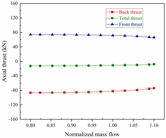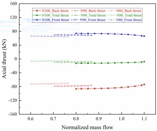The predicted characteristic curves of axial thrust under variable rotating speeds (100% N, 90% N, 80% N) are shown in Figure 12, whose changing law with the flow is the same as in Figure 7. As the speed decreases, both the magnitude of the front and back thrust is reduced, causing the resultant force to also decrease, whose direction still points to the compressor inlet. To sum up, the magnitude of the total axial thrust decreases as the rotating speed decreases or the mainstream flow increases.