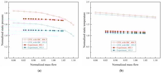 The above section has explained in detail that IBC has an important impact on the coupling characteristics, so it is necessary to study its internal flow field. The flow characteristics of IBC are mainly circular shear flow and radial differential pressure flow. Generally, aerodynamic parameters distributions in IBC are basically the same in the circumferential direction, and there are pressure and temperature gradients in the radial direction. In order to reflect the pressure loss and temperature drop of the cavity leakage flow along the centripetal movement on the static wall of IBC, the measurement value of ps or Ts on the maximum radius 406.3 mm and the minimum radius 193.5 mm are representatively analyzed from Figure 2. The detailed test data analysis of 16 measuring points can refer to the author’s previous research [25], and this article mainly analyzes the pressure loss and temperature drop of the two end points. The numerical results on the same positions in the cavity are also respectively extracted from Figure 3b to compare with the experimental data.