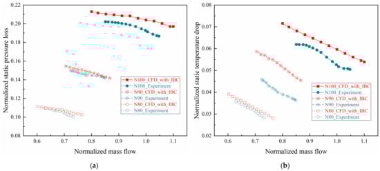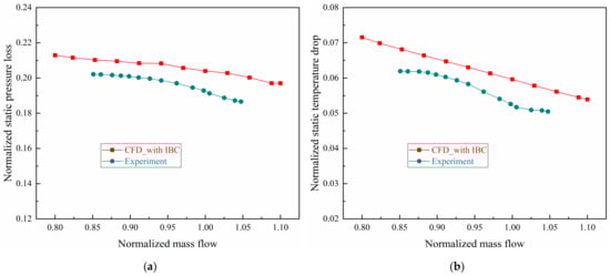 Figure 9 shows the characteristic curves of the predicted and measured dimensionless ps loss and Ts drop on the static wall of IBC under design rotating speed. The experimental or computational dimensionless ps loss or Ts drop are the ratios of values of ps or Ts difference between the maximum and minimum radius and the compressor inlet pt or Tt. The specific mathematical expressions are shown in Equations (3) and (4). They essentially reflect the pressure loss and temperature drop of the airflow in the direction of centripetal movement along the decreasing radius, replacing the respective gradient for analysis. It can be seen that the ps loss and Ts drop in the tests and calculations both increase with the decrease of mainstream flow, meaning the radial ps and Ts gradients increase as the flow decreases.