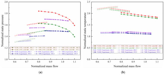 Figure 8 shows the characteristic curves of predicted and measured dimensionless ps and Ts at the maximum radius and the minimum radius on the static wall of IBC under design rotating speed. The experimental or computational dimensionless ps or Ts are the ratios of values of ps or Ts and compressor inlet pt or Tt. The specific mathematical expressions at the two end points are shown in Equations (1) and (2). We can see that the ps and Ts at two points in test or calculation both increase as mainstream flow decreases, but the numerical value of Ts is much higher than the experimental value as a whole. Because there is a varying radial heat flow distribution on the solid wall of the casing in test, resulting in heat transfer effect with the internal flow field in IBC, which is ignored in the simplified calculation using adiabatic boundary conditions.
