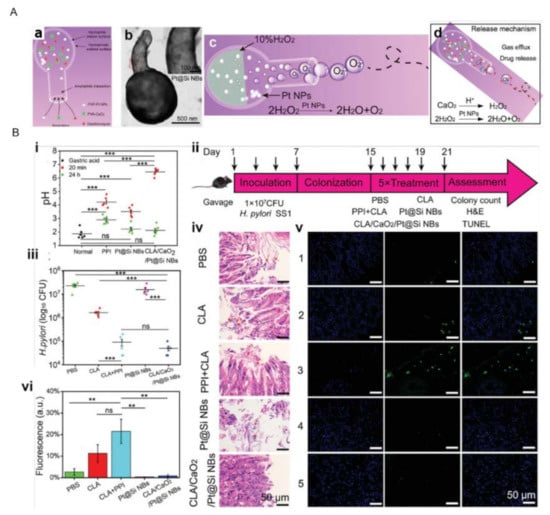 (A): (a) Selective loading of hydrophilic NPs on the interior surface of Si NBs. (b) TEM imaging of Pt@Si NBs. (c) Schematic diagram of the nanomotor driving mechanism. (d) Release mechanism of CLA. (B): H. pylori-infected treatment in vivo. (i) pH neutralization process at 20 min (red) and 24 h (green) after oral 400 µmol kg−1 PPI, 15 mg Pt@Si NBs, and 15 mg CLA/CaO2/Pt@Si NBs. (ii) Animal model treatment experiment process. (iii) Number of H. pylori in gastric tissue after different treatments. (iv) H&E staining and (v) the TUNEL staining of the stomach after different treatment (1. PBS, 2. CLA, 3. PPI + CLA, 4. Pt@Si NBs, 5. CLA/CaO2/Pt@Si NBs). (vi) Quantitative evaluation of TUNEL staining (** p < 0.01, *** p < 0.001, ns, not significant) (reproduced with permission from Ref. [54], published by John Wiley and Sons, 2021).