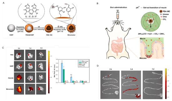Schematic illustration for (A) the preparation procedure of urease-powered micromotors using silica microparticle (SiMP) and polydopamine microcapsule (PDA MC), and (B) the oral delivery of urease-powered polydopamine micromotors for enhanced penetration and retention in the stomach. (C) Left panel: IVIS images of the intact stomach at 3 h, 1 d and 3 d post-oral injection of PBS, SiMP, PDA MC and micromotors and right panel: the corresponding quantified fluorescence intensity at each time point (n = 3). (D) IVIS images of the intestinal tract at 3 h, 1 d, and 3 d post-oral administration of micromotors. (* p ≤ 0.05, ** p ≤ 0.01, micromotor vs. PDA MC) (reproduced with permission from Ref. [55], published by Elsevier, 2021).