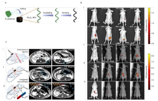 As mentioned above, one of the main challenges in NMR design is its biocompatibility. One of the solutions is to explore the nature database for biological units with inherited functionalities that can be employed in the design and engineering of the NMRs. The use of microorganisms such as sperm, neutrophils, algae, and bacteria in NMR design has been explored and promising results have been achieved [61,62]. Microalgae organisms have drawn much attention in the biomedical field as novel biological materials with inherent characteristics such as autofluorescent pigments, magnetic resonance signals, biodegradability, and low cytotoxicity [63,64]. Zhang et al. developed a microrobot based on Spirulina platensis (helical shapes) for active targeted delivery and imaging purposes in vivo [53,65]. They covered Spirulina platensis with Fe3O4 nanoparticles through a simple dip-coating process (Figure 5A). Integrating the Fe3O4 NPs into Spirulina platensis equipped them for remote actuation using an external magnetic field. They were able to swim in different media including DI water, blood, gastric juice, urine, and even peanut oil. As mentioned earlier, Spirulina platensis has instinct fluorescence, making it an ideal biomarker in biomedical applications. In this regard, their fluorescence stability was tested and the results reveal that over 60 min of illumination, the fluorescence was still stable, without any significant bleaching. Furthermore, the fluorescence signal was evaluated in different media such as neutral, alkaline, and acidic solutions, physiological media (containing 5% dextrose and phosphate-buffered saline), cell growth media, and isopropyl alcohol. The signal weakened only in acidic solution and IPA, while it remained without significant changes in the rest. The introduced microrobots have been used for in vivo imaging in (a) right below the dermis and (b) space between the parietal peritoneum and the visceral peritoneum of nude mice (Figure 5B). The results show that different factors contributed to the fluorescence signal, including (i) fluorescence characteristics, (ii) magnetization property, and (iii) an in situ environment. However, fluorescence-based biomedical imaging is a great help for the in vivo positioning of NMRs; it cannot penetrate deep tissues (more than few centimeters), which limits its application. One of the promising methods for deep tissues is magnetic resonance imaging (MRI), as Spirulina platensis covered with Fe3O4 NPs can function as MR imaging contrast agents. The observed images revealed that the intensity of the contrast is a function of two factors: (a) concentration and (b) magnetization time. By prolonging the magnetization time, the imaging contrast could be significantly increased. The Spirulina platensis robots were tested for in vivo MR imaging in deep tissue (i.e., stomach) using a mouse model (Figure 5C). The results of the two different doses (4 mg/mL and 8 mg/mL) reveal that the MR contrasts depend on the concentration (4 mg/mL < 8 mg/mL).