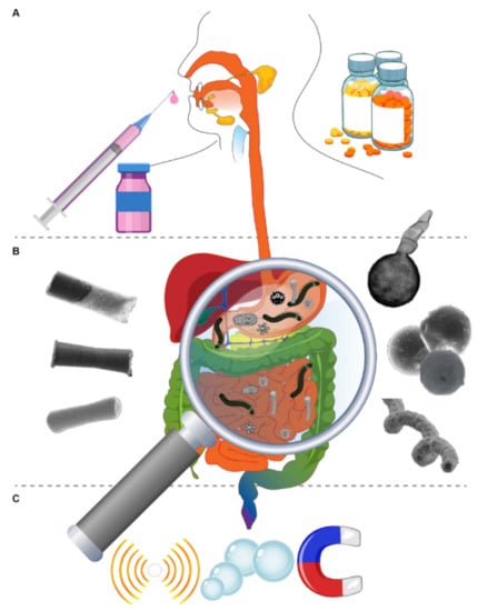 Schematic of reported in vivo treatment and imaging of stomach diseases using nano/microrobots. (A) Invented oral medicine based on nano/microrobots for prevention (vaccine) and treatment (tablet) of stomach diseases, (B) presenting the morphology of the reported nano/microrobots employed for treatment of stomach diseases and imaging. (C) Presenting the means used to propel nano/microrobots in the treatment of stomach diseases.