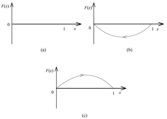 Figure 1. The dynamic evolutionary diagram of the government under various cases. (a) The dynamic diagram of governmental strategy when . (b) The dynamic diagram of governmental strategy when x = 0 is an evolutionary stable state. (c) The dynamic diagram of governmental strategy when x = 1 is an evolutionary stable state. - (2)