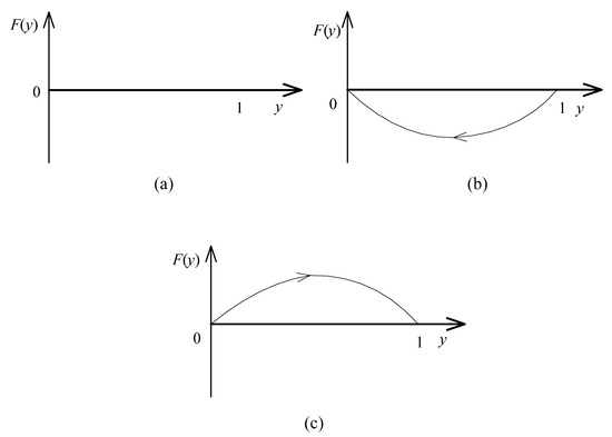 - If , y satisfies F(y) = 0 and F’(y) < 0 is the evolutionary stable state point of the export enterprise. The derivative of F(y) is:When , because F’(1) > 0, F’(0) < 0, y = 0 is an evolutionary stable state; that is, export companies will choose to maintain high-carbon production. This shows that when the government’s choice of active reaction is less than , the behavior of export companies still implementing high-carbon production is unlikely to be regulated, which provides them with convenient conditions for seeking short-term benefits. The dynamic diagram is shown in Figure 2b.