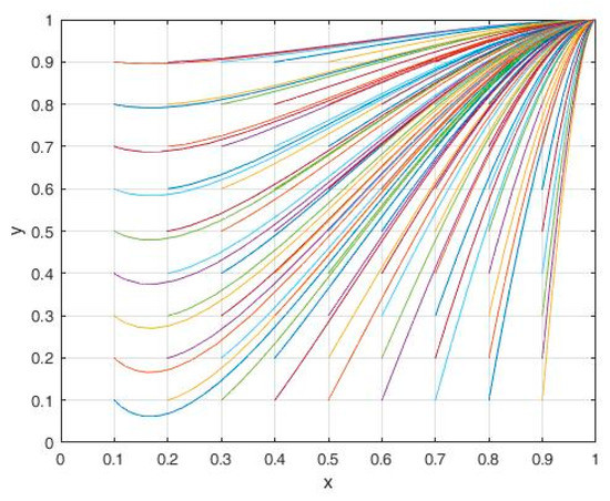 In order to verify the game results, we conducted numerical simulations. We set the values that meet Equation (15). Specifically, we let Gr = 18, Er = 3, Sg = 4, Gc = 5, Pg = 5, Pl = 8, Cl = 10. Then, we conducted the numerical simulation based on Equations (5) and (10). The diagram is shown in Figure 3. The x-axis means the initial probability that the government chooses an active reaction to the CBAM, and the y-axis means that the initial probability that the export companies choose low-carbon production (please see descriptions in Table 1). The curves in different colors denote the evolution trajectories of x and y with various initial values. In Figure 3, the initial values of x and y are set from 0.1 to 0.9 at intervals of 0.1. We see that the game evolves to the D (1, 1). This means the solution of the game is correct.