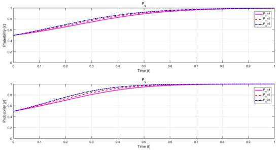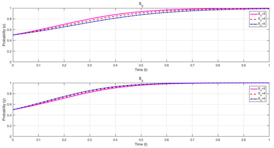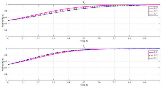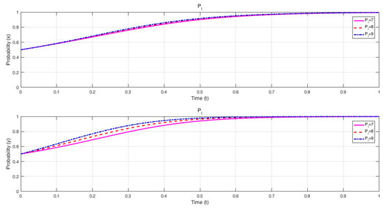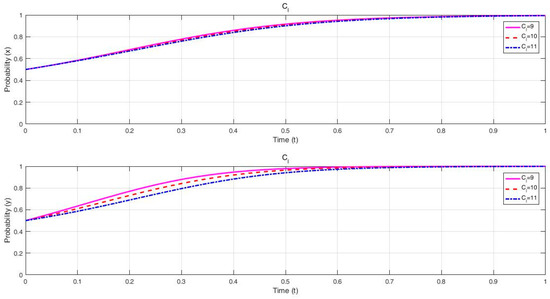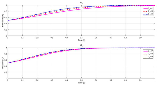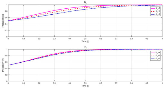 Next, we conducted sensitivity analyses of these key parameters. Values of each parameter float up or down due to one of the bases of the initial value. The initial probability of each actor is set to 0.5 to reflect the strategic neutrality. The evolutionary diagrams of each parameter (Gr, Er, Sg, Gc, Pg, Pl, Cl) are shown in Figure 4, Figure 5, Figure 6, Figure 7, Figure 8, Figure 9 and Figure 10.