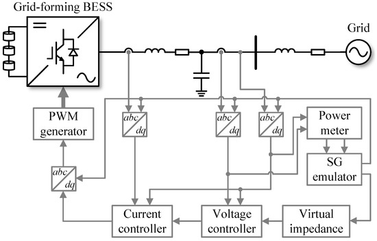 The basic configuration of a grid-forming BESS is shown in Figure 3. A grid-forming BESS operates as a virtual synchronous machine that mimics the external characteristics of a conventional synchronous generator (SG). As mentioned in Section 2.3.4, one of the salient features of a grid-forming converter, compared to a conventional grid-following converter, is the absence of the PLL used for grid synchronization. PLLs can still be adopted to measure the simultaneous frequency for implementing high-level controls; however, it is no longer a critical element for the operation of the converter. Consequently, a grid-forming BESS is designed to self-synchronize to the grid or directly operate in island mode based on internal phase references. The removal of PLLs makes grid-forming BESSs robust to voltage/frequency disturbances coming from the main grid.