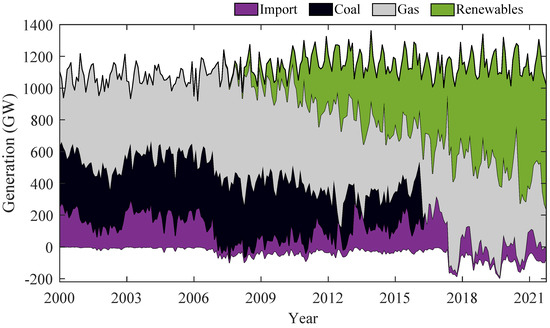 The state of South Australia is well known by its rapid transition to renewable generation. The increase in renewable energy generation has totally displaced coal-based generation and reduced imports from neighboring states and gas-based generating units. Figure 4 shows the energy mix in South Australia in the last 21 years [60].