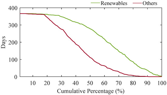 The gigawatt-scale South Australian grid is also demonstrating how IBR renewable energy can supply more than 60% of demand while keeping a secure and reliable electricity service. In the last calendar year (December 2020 to December 2021), 76.2% of the days had an IBR generation (wind, solar PV, BESS, and rooftop PV) over half the total generation of the state. Furthermore, 52.7% and 10.1% of annual IBR generations were more than 60% and 90% of the total generation, respectively. Figure 5 shows this cumulative renewable energy generation distribution for the calendar year [60].