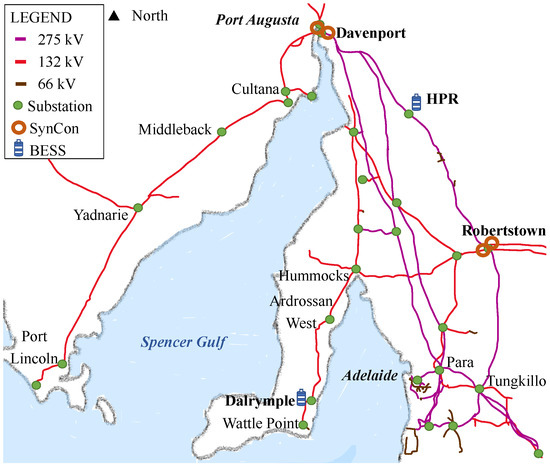 A complete technical assessment was carried out by ElectraNet and endorsed by AEMO [63]. The solution, consisting of the installation of four large SynCons on the transmission network, had a total capital cost of about A$190 million. The installation of all four synchronous condensers has been completed by September 2021. Each SynCon unit has a fault capability of 575 MVA at 275 kV, which helps to meet the system’s strength gap (fault level shortfall). Furthermore, to meet inertia requirements, synchronous condensers are equipped with flywheels to provide 1100 MWs, a total of 4400 MWs of inertia. Figure 6 shows the location of the synchronous condensers.