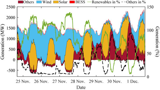 The integration of synchronous condenser into the transmission network has increased the secure use of renewable generation in the grid. At times, the participation of renewable generation is above 100%, meaning that South Australia exports clean energy to the rest of the NEM. For instance, Figure 7 shows the generation mix for a 7-day window, from 24 November to the 1 December [60]. During these days, renewable energy had a maximum participation of 137.9% (1904 MW) while gas-generating units and imports accounted for a 5.7% (78.9 MW). Nevertheless, due to the high variability of renewable energy resources, South Australia still requires the backup of traditional resources (gas) and imports to supply the demand during low renewable generation. For the same time frame, gas-generating units and imports accounted for a maximum participation of 94% (1856 MW) while renewable generation was only 7% (138.6 MW).