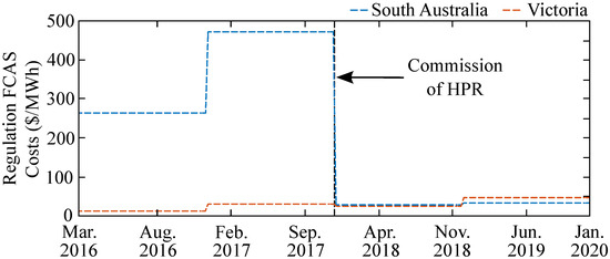 HPR has contributed in economically optimizing the use of generation asset by trading energy (arbitrage) in the wholesale energy market. Furthermore, HPR is registered in the Frequency Control Ancillary Services (FCAS) market. In particular, HPR participates in both regulation and contingency services to provide generation/demand balance and power system stabilization, respectively. For instance, as shown in Figure 9, HPR has helped to reduce in more than 91% the average yearly regulation FCAS costs for South Australia [68]. The participation of the battery has provided a cost-effective manner that competes with traditional generators, reducing prices to a level similar to the Victoria region.