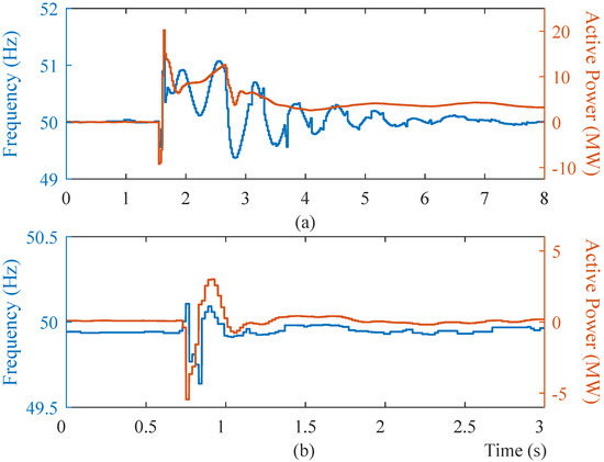 Frequency support of Dalrymple to system events: (a) Single phase to ground fault at the Ardrossan West–Dalrymple 132 kV line. (b) Single phase to ground fault at the Bungama–Blyth West 275 kV line (plots drawn with data from [70]).