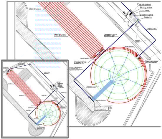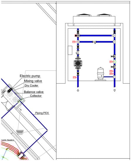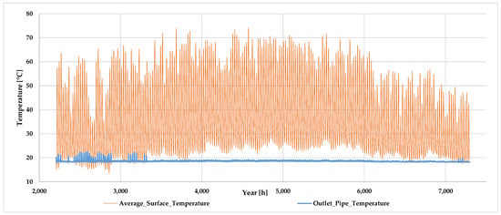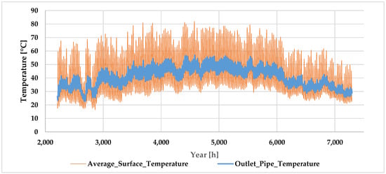Obviously, the greatest temperature difference between the inlet and the outlet was obtained from the copper piping, followed by that of radiant PEX-AL []. In this case, a difference between the two systems of only 3 °C was measured, justifying the opportunity to use PEX-AL as a cheaper material []. An aspect of fundamental importance for the realization of an efficient system is the identification of an adequate depth of installation of the piping system; that is, one that is able to maximize the temperature increase of the heat transfer fluid, and at the same time does not compromise the integrity of the pipe itself and the surface of the pavement. In order to avoid negatively affecting the durability and the floor covering without damaging the drowned piping, it is necessary to consider as the laying depth the one in which the “reflective cracks” no longer occur under traffic load. From an analysis of existing commercial systems and literature studies, this depth generally varies from about 40 mm to about 120 mm. If, on the one hand, the installation of the piping network at a depth of less than 50 mm, i.e., very close to the surface layer, obviously guarantees the achievement of higher temperatures of the carrier fluid, on the other hand it presents structural problems related to surface cracks, due to stresses concentrated near the pipes, and technical problems for the remaking of the road surface.