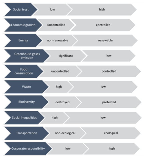 At the same time, the production of waste and the greenhouse effects kept growing. Ryszawska emphasises that such economies generate a vicious circle of interdependencies, as production growth causes consumption growth, and the latter in effect leads to the growing use of natural resources and higher emissions [19]. The ambitious goal of sustainable transition requires a move from brown economy to green economy (Figure 2). The energy transition must be regarded as part of a wider process of sustainable transition. It is essential to view changes in renewable energy use in a broader context and to integrate them into other efforts for sustainable development.