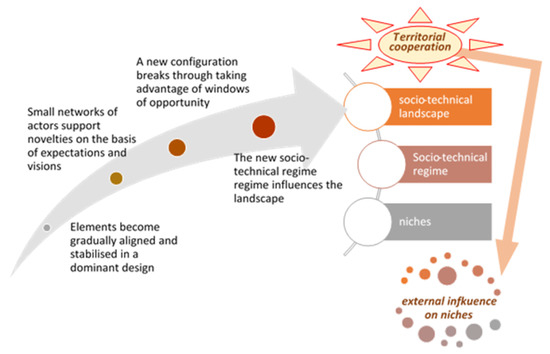 Numerous external factors may have an impact on niche development, including international cooperation stimulating energy transition [23,24,25,26]. Territorial cooperation [27] is a special case of international cooperation involving sub-state bodies (e.g., local administration, NGOs, research institutes). Such collaboration may stimulate sustainability transition.