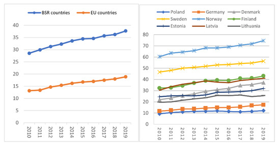 One of the strategy tasks was to reduce disparities in using renewable energy sources in BSR. The study of BSR usage of renewable energy in the years 2010–2019 (Figure 5) showed that the region presented positive results compared to the entire EU [43]. Nevertheless, the region included states that managed well the use of renewable energy (Norway, Sweden) and others (Germany, Poland) that considerably lowered the average.