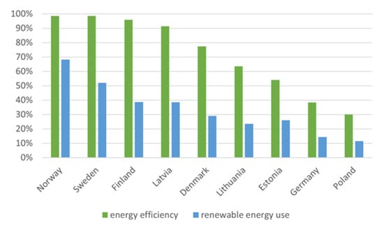 The relations between energy efficiency and renewable energy use are also worthy of attention (Figure 6). Countries enjoying the greatest energy efficiency (Norway, Sweden) demonstrate the best renewable energy use indicators. Germany and Poland found themselves on the other end. In 2014, the mean energy efficiency indicator in BSR read 71.97% with the mean energy efficiency use indicator of 33.55%. German indicators read 38.3% and 14.38%, respectively, and Poland showed 30.1% and 11.6%, respectively. Scientists studying energy issues agree that the development of renewable energy requires not only resigning from non-renewable energy but also “creating sustainable energy development and supporting cooperation” [44].