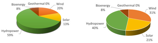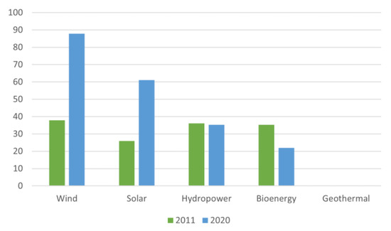 Comparing the structure of renewable energy capacity in BSR countries in the years 2011 and 2020 (Figure 7), we can note the dominant position of hydropower energy. However, the use of wind energy and solar energy showed a percentage growth.
