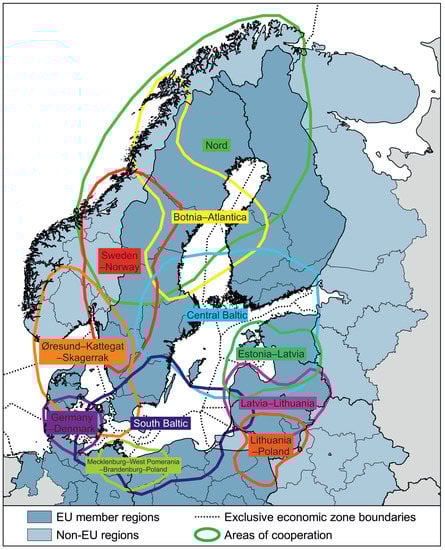 The development of territorial cooperation within BSR was financially supported by the EU cohesion policy instrument called the European Territorial Cooperation (ETC). The cohesion policy followed the provisions of the Treaty on the Functioning of the European Union, which committed EU bodies to undertake measures to enhance economic, social, and territorial cohesion and reduce disparities between the levels of development of the various EU regions [48]. The European Structural and Investment Funds were established to finance these measures. One of the funds—the European Regional Development Fund—ensured financial means for ETC. Three types of territorial cooperation were identified [49]: