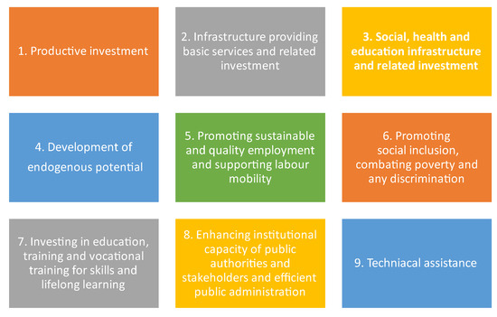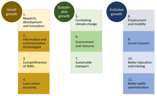 Thematic objectives for EU programmes were defined in line with Agenda 2020 priorities [51] supporting smart, sustainable, and inclusive growth. The European Commission set 11 Thematic Objectives (TO) in ETC programmes for the period 2014–2020 [52] based on three priorities of Agenda 2020 (Figure 12).