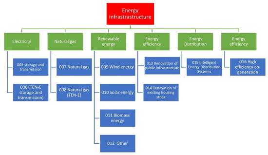 Intervention group number 2 identified the strand Energy Infrastructure (Figure 14) comprising 16 Interventions including four related to renewable energy: wind energy, solar energy, biomass energy, and others. The last category embraced hydroelectric, geothermal, and marine energy and renewable energy integration including storage, power to gas, and renewable hydrogen infrastructure.