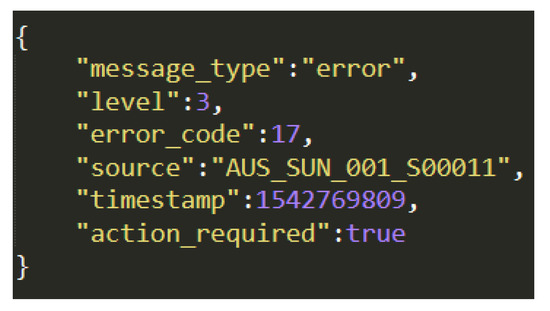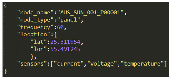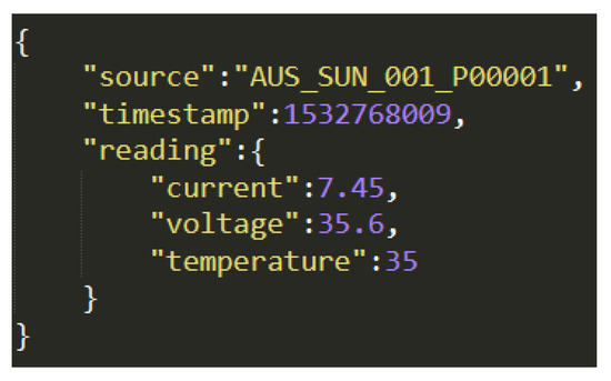 Once data is at the Kafka broker, a connectors from Kafka to Spark make it possible to stream it in real-time to stakeholders, apply artificial intelligence algorithms to produce real-time analytics, or store the information in Hadoop Distributed File System (HDFS) [41]. At the backend, an orchestra of Celery [42] workers and Spark [43] jobs are deployed to offer microservices such as resource management, data management, data processing, and many others. Communication between Celery’s microservice workers takes place over message-oriented middleware based on AMQP [44]. The core also includes a MongoDB [45] database which keeps records of all edge stations operating in the remote facilities. This data is used for device management as well as processing data, where each device has a profile that describes its location, the type of resources it offers, as well as miscellaneous O&M information. A sample of an edge device profile is shown in Figure 5, while a packet generated by that edge devices is shown in Figure 6.