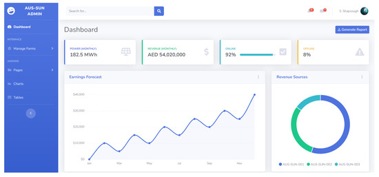 Data analytics microservices provide stakeholders with summarized and detailed reports about the performance of remote solar farms at varying granularity levels. Moreover, this category hosts microservices cable of performing intelligent analytics including running machine learning and deep learning algorithms. Such algorithms are used to generate virtual models of solar farms which can then be used to generate customized forecasts, predict output, and plan accordingly. For example, a stakeholder might be interested in viewing the output forecast for multiple distributed facilities. Such report is needed for power planning in major grids in order to plan power distribution and access to power reserve [46,47]. Models are also used to perform preventative and reactive maintenance in order to prevent short-term and long-term disturbances in solar energy production from propagating through the grid. Using data acquired from operating facilities, individual models can be constructed for the system on the facility, string, and module level. The models run in parallel with the facility and are used to detect anomalies or deviation from expected performance, or schedule maintenance activities [48,49]. The increase in granularity consequently increases the accuracy of predictions by factoring the unique and individual conditions of each module, which can be affected by the geographical and electrical context of a module.