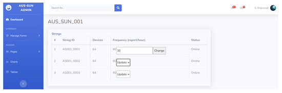 The front-end consists of a web application that allows stakeholders to monitor the performance of solar facilities in real-time. Stakeholders also have access to information regarding monthly power output and earnings, individual facility contribution, and earnings forecasts for the upcoming months. The web application also allows stakeholders to view detailed information per facility, as well as modify system properties such as data granularity and publishing frequency. Furthermore, data analytics such as forecasts, anomaly classifications, and system diagnostics are readily available. Samples of the admin dashboard are shown in Figure 7 and Figure 8, while a sample of system property control, specifically device frequency control, is shown in Figure 9.