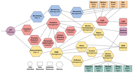 Figure 10 shows the microservices architecture. The services required in a solar power monitoring system can be roughly categorized into three types: real-time monitoring, intelligent analytics, and Operation and Maintenance (O&M). In each type of service, several workers are implemented to provide different microservices which collaborate on various tasks and continuously exchange data between them as well as the rest of the system.