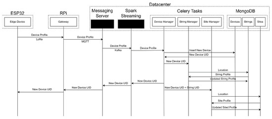 A regularly expected event is the addition of a new edge node to the system. This can include a module monitoring device, a battery monitoring device, a weather station, or any type of device expected to operate at the farm and provide information about the state or context of the farm. For the node to start operation, the system needs to not only update its registry of devices, but also update all context-related registers such as the string, array, and farm the devices is to be deployed in. Other actors in the system should also be made aware of the addition of the devices and the type of data resource it offers, and whether the device offers unique new information or has been added to reduce the load on other devices provided similar data resource.