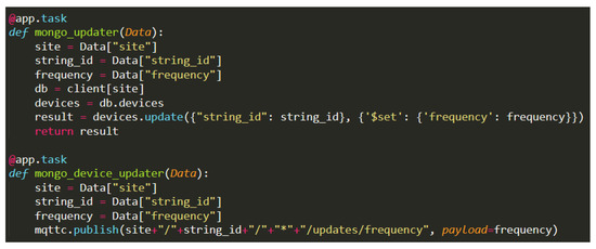 The process is divided into individual tasks which are distributed across several Celery workers, where each worker specializes in handling a specific segment of the process. For example, Figure 14 shows the worker code for updating the entry for the string in the database, as well the worker which publishes the update to all devices in the string so that they start reporting at the selected frequency.
