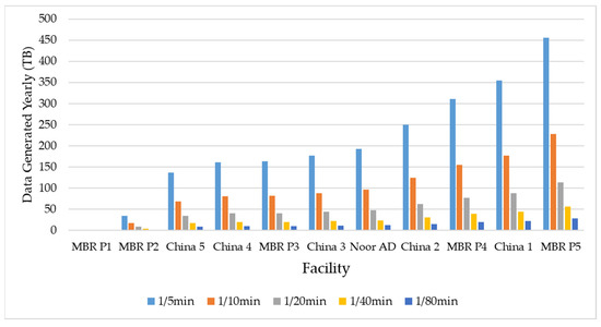 Using the previous numbers, it is possible to estimate the amount of data generated yearly based on the frequency of reporting. Figure 16 shows the estimated data generated yearly per facility for reporting frequencies that vary from once every 5 min to once every 80 min.