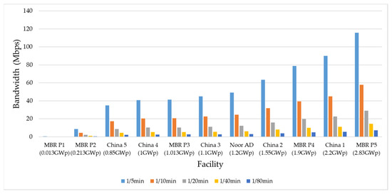 Using the same data sizes, it is possible to estimate the bandwidth required by each facility in order to reliably transmit information back to the core. The bandwidth requirement per facility is shown in Figure 17. As the figure shows, a facility of the size of MBR P1 where observations are sent every 5 min would require a bandwidth of 0.53 Mbps. A facility of the size of MBR P5, however, would require a bandwidth of 115.7 Mbps. The maximum uplink data rate that can be handled by a LoRaWAN gateway is 50 kbps [55]. This means that even at highest publishing frequency, MBR P1 would require 11 gateways, while MBR P5 requires 2320 gateway devices. Publishing at lower frequencies would significantly reduce the number of gateways required.