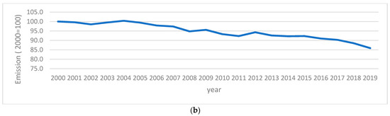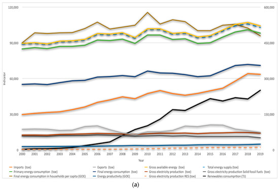 Figure 1b shows the intensity of greenhouse gas emissions of energy consumption 2000 = 100. The indicator was separated due to the percentage values that were not visible in relation to other indicators values. The indicator determines how many tonnes of CO2 equivalent related to energy production are emitted in a given economy per unit of energy consumed. The year 2000 is the base year, accounting for 100% (2000 = 100).