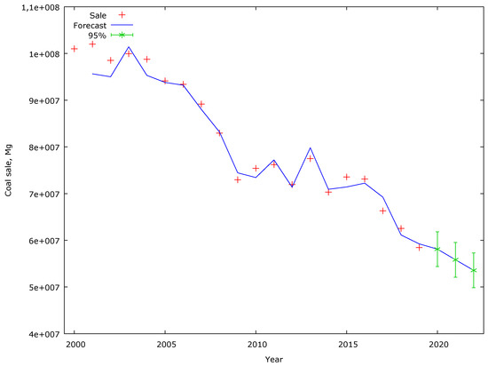 Building an accurate and reliable forecast is the basis for effective planning of coal production tailored to fuel demand. It provides access to information on the necessary level of future production. The level of production factors required can, therefore, be planned in advance. This makes it possible to optimise employment, production capacity, and reduce production costs. The results of the forecast, as well as empirical data on the volume of hard coal sales in Poland, are presented in Figure 2. The forecast indicates that if the trend of indicators that influence the level of demand for coal does not change, demand will fall. The forecast was made up to 2022. In this time horizon, compared to the last known observation, the sales volume will decrease by approximately 9%.