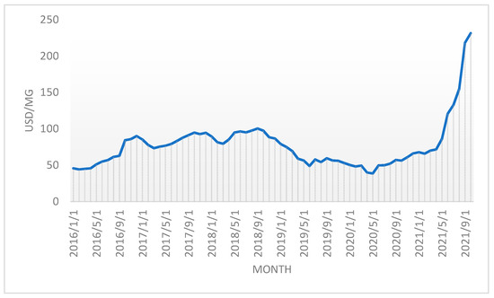 - MarketWatch. Available online: https://www.marketwatch.com/investing/future/mtfc00/download-data?startDate=1/1/2019&endDate=11/05/2021 (accessed on 5 September 2021).