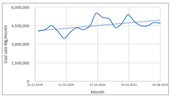 Hard coal demand in Poland in the period 1 January 2020–8 January 2021 and the linear trend of the time series [32].