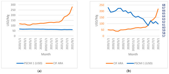 CIF ARA hard coal prices and the PSCMI 1 indicator [32]. (a) one y axis; (b) an auxiliary axis.