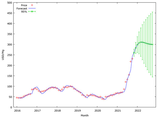 The forecast presented in Figure 6 indicates that, over the next few months, the upward trend in coal prices will continue and then stabilise. The forecast was made to present the development trend of the analysed phenomenon. The confidence interval of the forecast widens (and this is a natural phenomenon) because the forecast was made for 12 months, and 12 steps forward is a distant time horizon. Therefore, Figure 6 also presents the confidence interval (95%). It represents the range in which the price of coal may move. It can be applied in the case of scenario planning, which would be appropriate for forecasts used by coal companies.