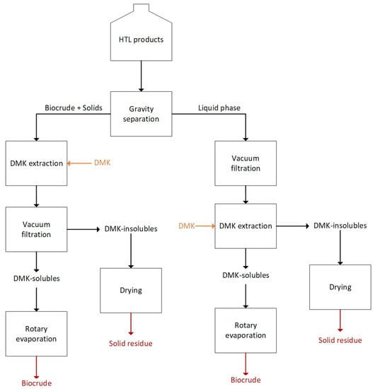 Biocrude and solids were gravimetrically separated from the liquid phase and the former were washed with DMK and vacuum-filtered at 1 µm over a Whatman glass microfiber filter. The DMK-solubles were then rotary evaporated at 60 °C, 50 kPa, 60 rpm to recover the biocrude. The filter with the solid residue (SR) was oven-dried at 105 °C overnight and weighed. A small quantity of solids and biocrude remained dispersed in the liquid phase after gravimetric separation and, consequently, the latter was subjected to the same aforementioned procedure for biocrude and solids collection. The DMK collected during plant washing was vacuum filtered and subjected to rotary evaporation. The products collected from the pistons of the depressurization system were recovered using the same procedure described for the liquid phase. Figure 2 reports a scheme of the extraction procedure for the separation of HTL products. The biocrude used in this work was recovered through DMK washing after gravimetrically separation of the liquid phase.