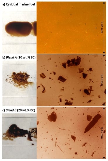 Based on the optical microscopy image reported earlier, and without relying on more sophisticated techniques (e.g., laser scattering) to quantitatively assess the quality of the mixing between, for example in terms of size distribution of the droplets of biocrude in the continuous phase (the marine fuel), nor in more energy-intensive mixing techniques, the authors stipulate that manual mixing of a viscous biofuels, itself having a highly complex and articulated composition with compounds of different polarities, can lead to the formation of droplets of irregular size when mixed with marine fuel. The use of high-shear techniques is therefore suggested to overcome this limitation when forming the mixture.