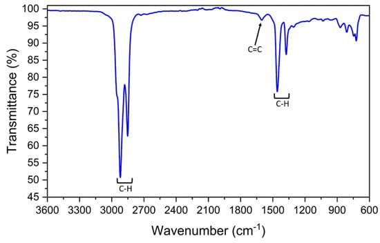 Marine fuel (Figure 4) mostly presents CH signals typical of alkanes, as the C-H in CH2 vibration and CH in CH3 stretching [42,43] around 2920, 2960 and 2860 cm−1, and the signals at 1375 and 1460 cm−1 related to the C-H bond in CH3 bending [43]. However, a small band around 1600 cm−1 points out the presence of C=C stretching ascribed to aromatics compounds such as polycyclic aromatics [44].