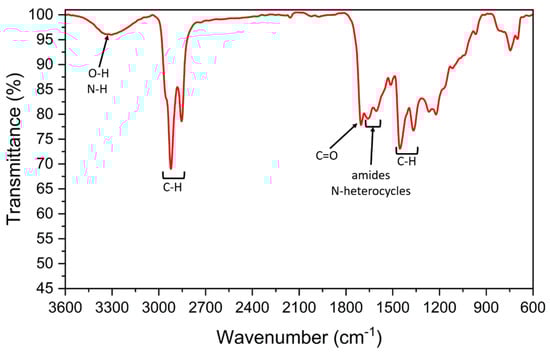 The SS biocrude spectrum (Figure 5) also presents signals in the aliphatic C-H range (2920–2860, 1460 and 1380 cm−1 [43]) which were attributed to lipids or hydrocarbons presence, but oxygenated groups are also detected, such as the OH signal around 3300 cm−1, also ascribed to N-H stretching [45], or the peak around 1700 cm−1 which highlights the presence of C=O groups [43] probably related to carboxylic acids or amides. The signals around 1600–1660 cm−1, ascribed to the presence of amides and nitrogen heterocyclic compounds in the biocrude [43,44,45,46,47].