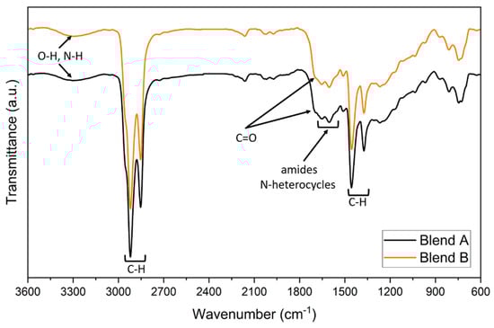 Both blends (Blend A and B) show the peculiar peaks of the SS crude, such as the 3300 and 1700 cm−1 signals related to the oxygenated and nitrogen compounds of the biocrude (i.e., fatty acids, and primary amides [43,48]) as well as the signals around 1600–1660 cm−1, most likely amides and pyrrolic compounds [38,43,45], but with higher C-H signals at 1460 and 1375 cm−1, typical of the MF, therefore—as expected—showing both of the feedstock’s chemical group’s characteristics (Figure 6) and thus confirming, within the limit of the qualitative nature of the analysis, the formation of a mixture.